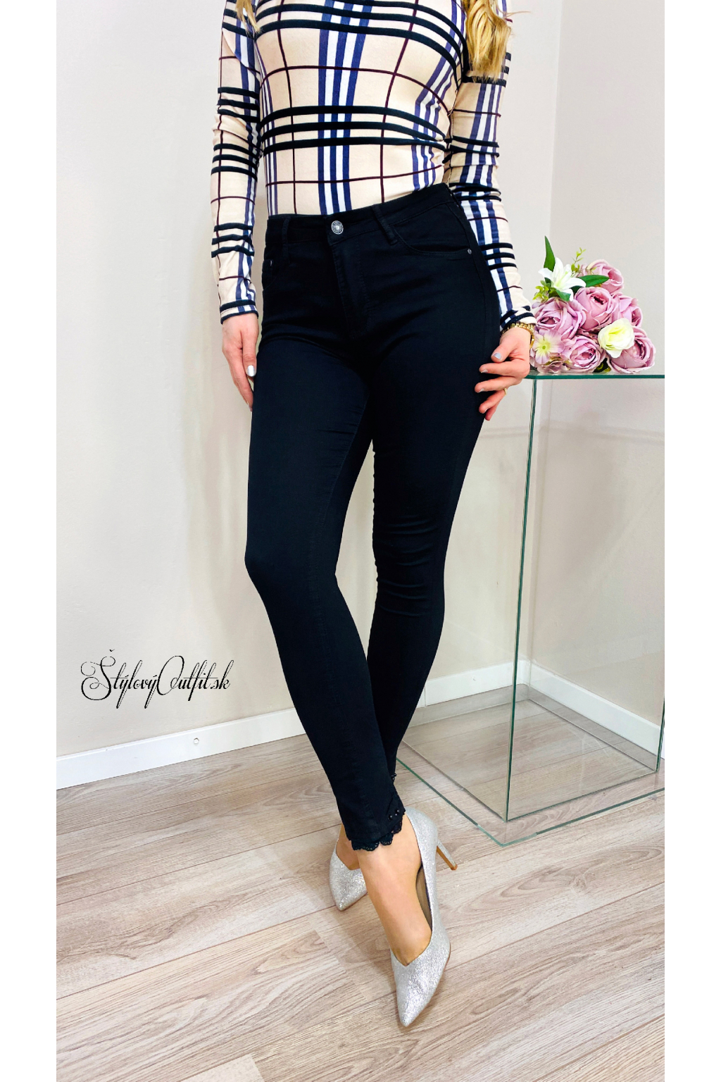 Štýlové rifle sýtej čiernej farby doplnené originálnym zdobením v spodnej časti. Sú krásne do detailu prepracované, doplené mašľu s kryštálikmi, čiernymi perlami a čipkou, vďaka čomu pôsobia efektne a zaujímavo :) Rifle majú vyšší pás a krásny strih, ktorý skvele vytvaruje postavu. Sú elastické a príjemné pri nosení. Výborne doplnia jarné aj letné outfity.
